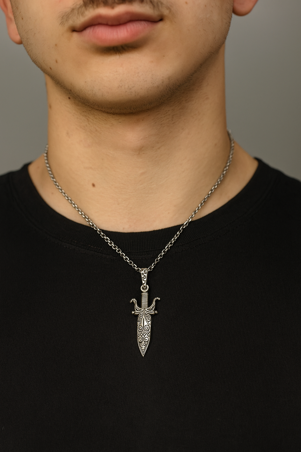 A handcrafted sterling silver dagger pendant with intricate carvings, symbolizing strength and timeless warrior elegance.